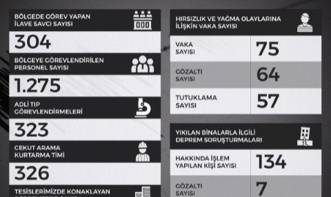 Adalet Bakanlığı sosyal medya hesabından yaptığı açıklamada, bölgede 304 ilave savcının görevlendirildiğini açıkladı. Bölgeye görevlendirilen ilave personel sayısının bin 275 olarak açıklandığı paylaşımda, adli tıp görevlendirilmeleri için 323, CEKUT Arama Kurtarma timi personel sayısı 326, Adalet Bakanlığı tesislerinde konaklayan depremzede sayısı ise 2 bin 146 olarak açıklandı. Hırsızlık ve yağma olayları hakkında 75 vaka olduğu, 64 kişinin gözaltına alındığı ve 57 kişinin tutuklandığı duyuruldu. Yıkılan binalarla ilgili 134 kişi hakkında işlem yapıldığı, 7 kişinin gözaltına alındığı ve 3 kişinin tutuklandığı açıklandı.