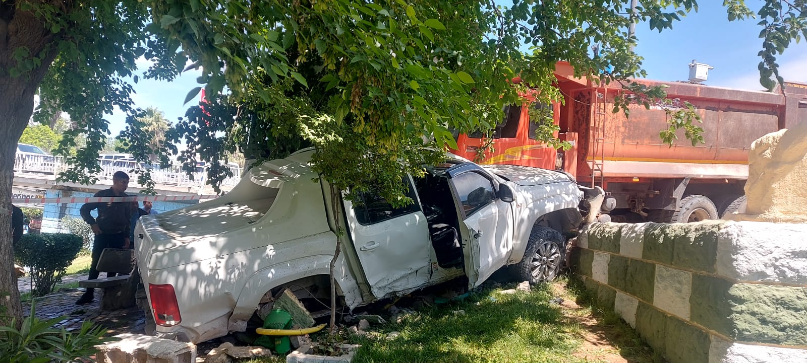 Şanlıurfa istikametinden gelmete olan damperli kamyonun frenin patlaması sonucunda iki araca çarptı.