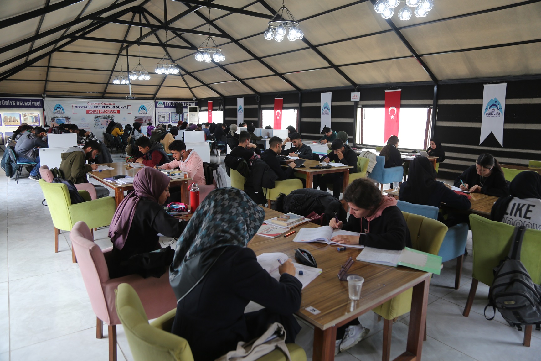 Şanlıurfa merkez nüfusunun yüzde 44’ünün yaşadığı ilçe olan Eyyübiye’de, başarılı olmaları için eğitim materyallerinden öğretmene, kablosuz internetten bilgisayara, çay, kahve ve kek ikramına kadar tüm ihtiyaçları karşılanan gençler, harıl harıl üniversite sınavlarına hazırlanıyor.