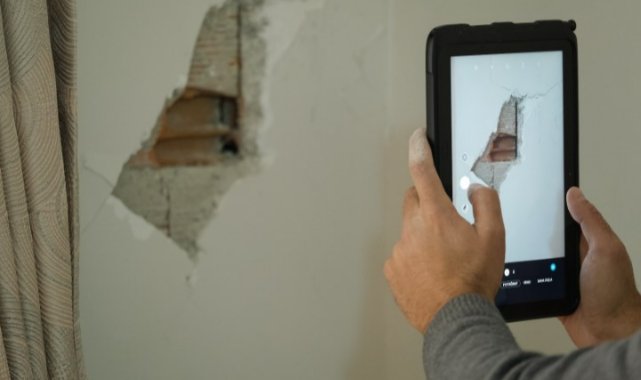 Depremden etkilenen ve kullanılmasında sakınca bulunan binaları tespit eden ekip, kolon hasarı ve çatlak olan binaları hem içeriden hem dışarıdan tespit ediyor.