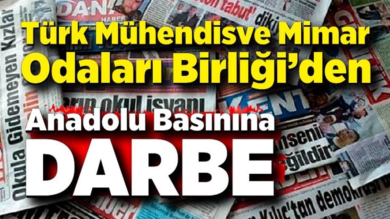 Oda Merkezi bulunan yerlerde birer gazeteyle duyurur ve Odalara en az on gün önceden bildirir.” denilmekteydi.O DUYURULAR, BUNDAN BÖYLE TMMOB’ NİN KURUMSAL SİTESİİNDE YAYIMLANACAK..Anadolu Basınından tepki toplayan kararda: “2/12/2002 tarihli ve 24954 sayılı Resmî Gazete’de yayımlanan Türk Mühendis ve Mimar Odaları Birliği Ana Yönetmeliği’nin 5’inci maddesinin birinci fıkrasının (c) bendinde yer alan “Oda merkezlerinin bulunduğu yerde bir gazetede”, (e) bendinde yer alan “Oda merkezlerinin bulunduğu yerlerde birer gazetede” ve aynı bentte yer alan ‘Oda Merkezi bulunan yerlerde birer gazeteyle” ibareleri “Birliğin ilan yeri ile Birlik kurumsal internet sitesinde’ şeklinde değiştirilmiştir.Aynı Yönetmeliğin 24’üncü maddesinin birinci fıkrasının (k) bendinde yer alan “Oda merkezi bulunan yerlerde birer gazete ile” ibaresi “Birliğin ilan yeri ile Birlik kurumsal internet sitesinde” şeklinde değiştirilmiştir.Aynı Yönetmeliğin 57’nci maddesinin birinci fıkrasının (d), (e) ve (f) bentlerinde yer alan “Oda merkezinin bulunduğu yerde bir gazetede” ibareleri “Birliğin ilan yeri ile Birlik kurumsal internet sitesinde” şeklinde değiştirilmiştir” derildi.