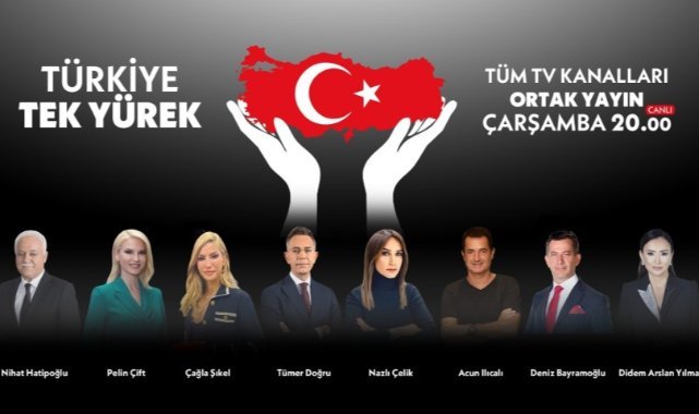 Türkiye’yi yasa boğan deprem felaketinde yaraları sarmak için 15 Şubat Çarşamba saat 20.00’de düzenlenecek yardım programı tüm televizyon kanallarını bir araya getiriyor. Başta Kahramanmaraş ve Hatay olmak üzere Adıyaman, Gaziantep, Adana, Osmaniye, Malatya, Diyarbakır, Şanlıurfa, Kilis’i etkileyen depremlerin yıkıcı sonuçlarını yaşayan vatandaşları için Türkiye’nin tek yürek olacağı canlı yayın tüm kanallarda aynı anda ekranlara gelecek. Nihat Hatipoğlu, Pelin Çift, Çağla Şikel, Tümer Doğru, Nazlı Çelik, Acun Ilıcalı, Deniz Bayramoğlu, Didem Arslan Yılmaz moderatörlüğünde yapılacak ortak yayında sanat, iş ve spor dünyasının önde gelen isimleri ve halk depremzedelere destek olacak.