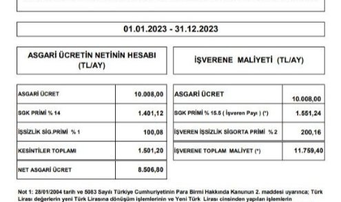 Ocak 2023’ten itibaren verilecek olan asgari ücretin işverene maliyeti de belli oldu. Yapılan hesaplamaya göre brüt 10 bin 8 lira olan asgari ücrete ek olarak bin 551 lira 24 kuruş SGK primi (işveren payı), 200 lira 16 kuruş da işveren işsizlik sigorta primi eklendi. Böylece asgari ücretin işverene maliyeti 11 bin 759 lira 40 kuruş olarak hesaplandı.