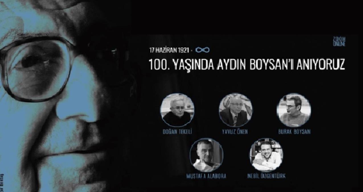 1945 İstanbul Devlet Güzel Sanatlar Akademisi mezunu, TMMOB Mimarlar Odası kurucularından, yönetim kurulu üyeliği, ilk genel sekreterlik ve İstanbul Şube Başkanlığı yapmış mimar, yazar ve gazeteci Aydın Boysan, 100.doğum gününde, TMMOB Mimarlar Odası'nın 13 Şubesi ve Fındıklı Belediyesi işbirliğiyle düzenlenecek programla anılacak. Etkinlik online olarak 17 Haziran Perşembe günü saat 14.00'da yapılacak.