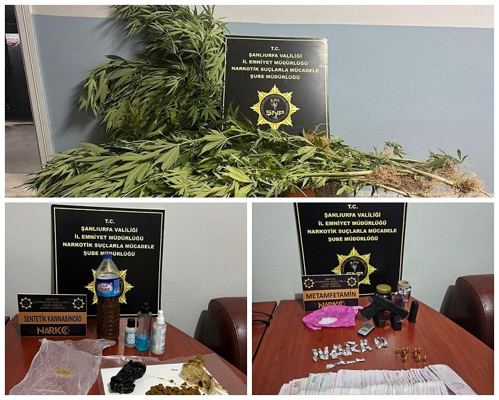 Birecik ilçesinde gerçekleştirilen çalışmalarda yüklü miktarda uyusturucu maddesi, silah, fişek ve bir miktar para ele geçirildi.