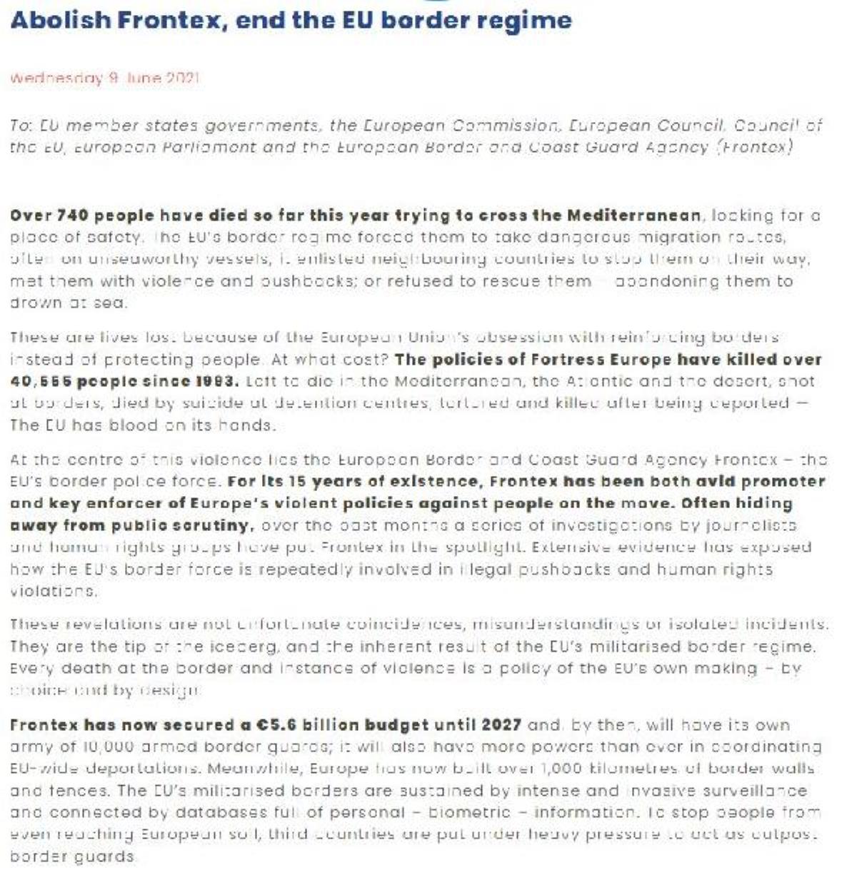 Saving Humans Mediterranea'nın resmi internet sitesinden yayınlanan mektupta, "Bu yıl şimdiye kadar 740'tan fazla insan güvenli bir yer aramak için Akdeniz'i geçmeye çalışırken öldü. AB'nin sınır rejimi (Frontex) onları genellikle denize açılmaya elverişli olmayan gemilerde tehlikeli göç yolları kullanmaya zorladı. Onları yolda durdurmak için komşu ülkeleri görevlendirdi. Onları şiddetle karşılayarak ya da kurtarmayı reddederek denizde boğulmaya terk etti" denildi.