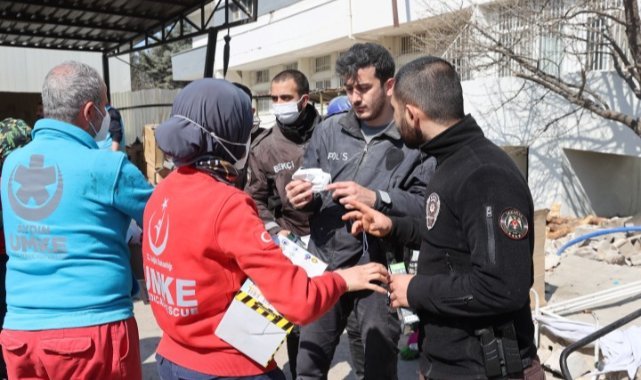 Halk Sağlığı Genel Müdürlüğü yetkilisi Dr. Sertaç Polat, “Sağlık Bakanlığı olarak depremin ilk gününden itibaren sahadayız. Yaraları sarmaya çalışıp elimizden geldiği kadarıyla da vatandaşlarımızın yanında oluyoruz. Ancak şimdi yeni bir faza geçtik. Enkaz kaldırma işlemleri yapılıyor. Dolayısıyla halkın sağlığını korumak amacıyla burada Sağlık Bakanlığı olarak bir takım önlemler aldık. Bunlardan en önemlisi; özellikle enkaz kaldırılırken ortaya çıkan bir takım toz ve partiküllerin insan sağlığına vermiş olduğu zararı önlemek. Bunun için bizim dağıtmış olduğumuz maskeler çok kıymetli. Kesinlikle takmaları gerekiyor. Çünkü 03 mikronun üstündeki tüm partikülleri bu maskelerimiz engelliyor. Dolayısıyla akciğerlerde oluşabilecek diğer hastalıkları önlemenin en önemli yolu maske takmak. Özellikle enkazda çalışan personellerimiz, buranın güvenliğini sağlayan, 7/24 burada olan kolluk kuvvetlerimiz, yine aynı şekilde buradaki çadırlarda kalan vatandaşlarımızın zararlı partiküllerden etkilenmemesi için bu maskeleri takmalarını öneriyoruz” şeklinde konuştu. Enkaz kaldırma ekipleri Sağlık Bakanlığına dağıtmış oldukları maskeler için teşekkür ederken, çalışma sırasında aldıkları maskeleri çıkartmayacaklarını ifade ettiler.