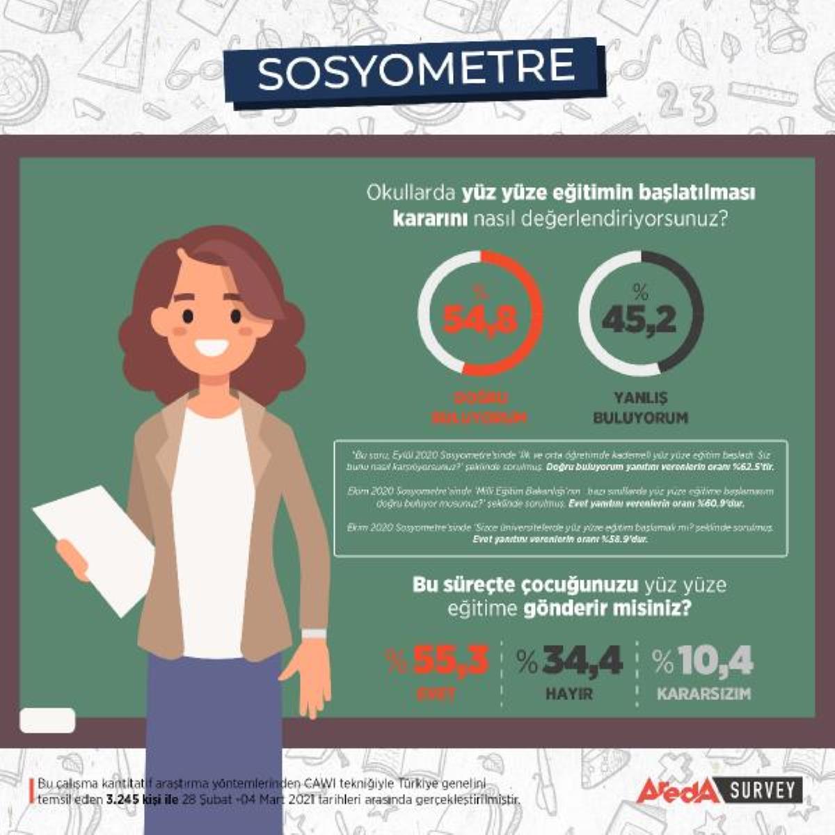 3 bin 245 kişinin katıldığı şubat ayı Sosyometre araştırmasına göre, okullarda yüz yüze eğitim faaliyetlerini doğru bulan katılımcıların oranı yüzde 54,8 olurken, yanlış bulduğunu ifade eden katılımların oranı ise yüzde 45,2 oldu. Eylül 2020 tarihinde gerçekleştirilen Sosyometre araştırmasında ise katılımcılara, "İlk ve orta öğretimde kademeli yüz yüze eğitim başladı. Siz bunu nasıl karşılıyorsunuz" şeklinde sorulan soruya katılımcıların yüzde 62,5'i 'doğru buluyorum' cevabını vermişti.