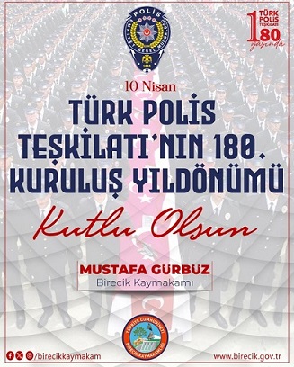 Birecik Kaymakamı Mustafa Gürbüz sosyal medyada twitter hesabındaki paylaşımında “ Türk Polis Teşkilatı’nın 180. kuruluş yıl dönümünü kutluyor, bu vesileyle tüm Şehitlerimizi rahmetle, Gazilerimizi minnetle anıyoruz.” açıkladı